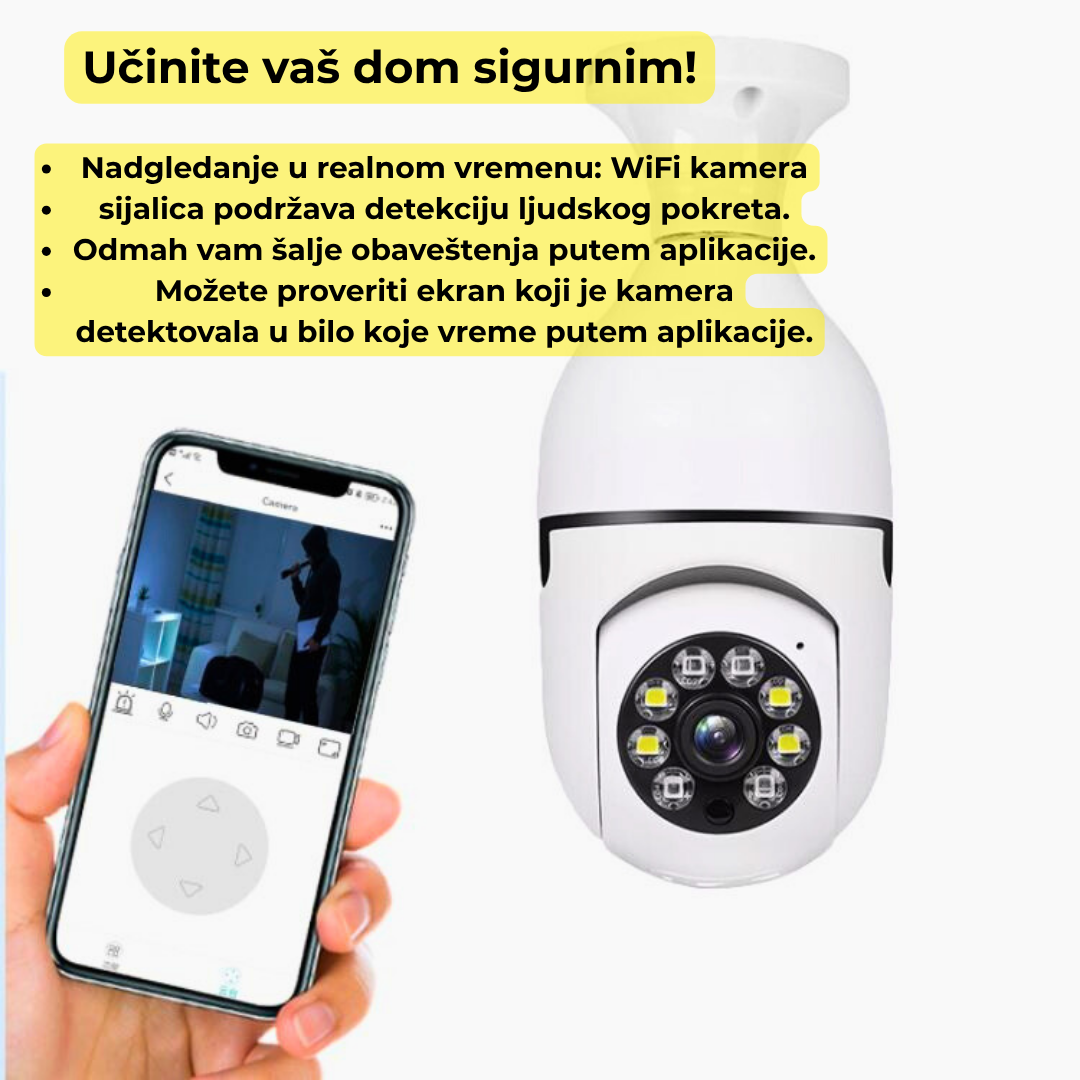 Bežična WiFi kućna kamera u obliku sijalice kombinuje sigurnost i diskretnost u jednom uređaju. Jednostavno je zavrtite u bilo koju E27 grlo i povežete na 2.4 GHz mrežu, bez dodatnih kablova ili montaže. Sa 360° (horizontalno) i 90° (vertikalno) opsegom, pruža potpunu pokrivenost prostora, dok aplikacija za Android/iOS omogućava pregled uživo i obaveštenja o detekciji pokreta u realnom vremenu.